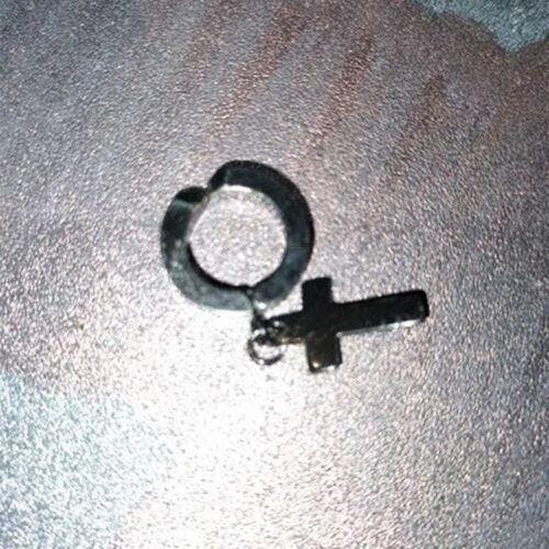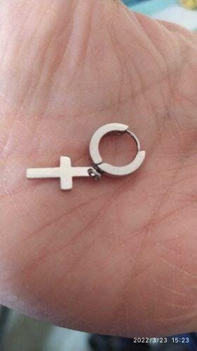 Coppia di Orecchini a semicerchio con pendente a croce color argento.